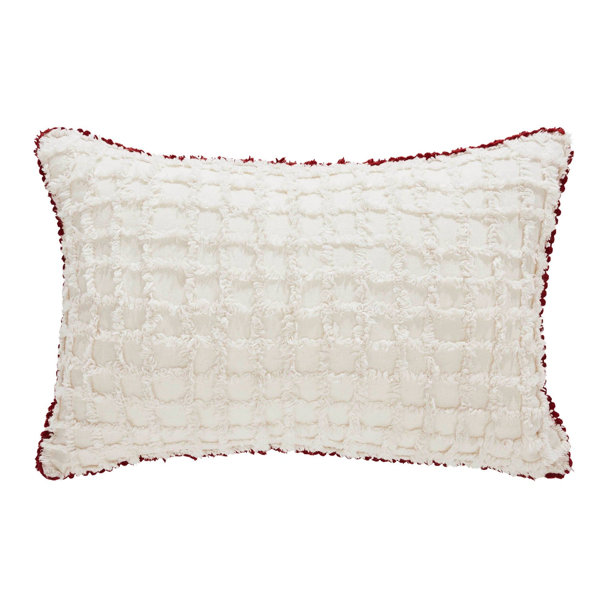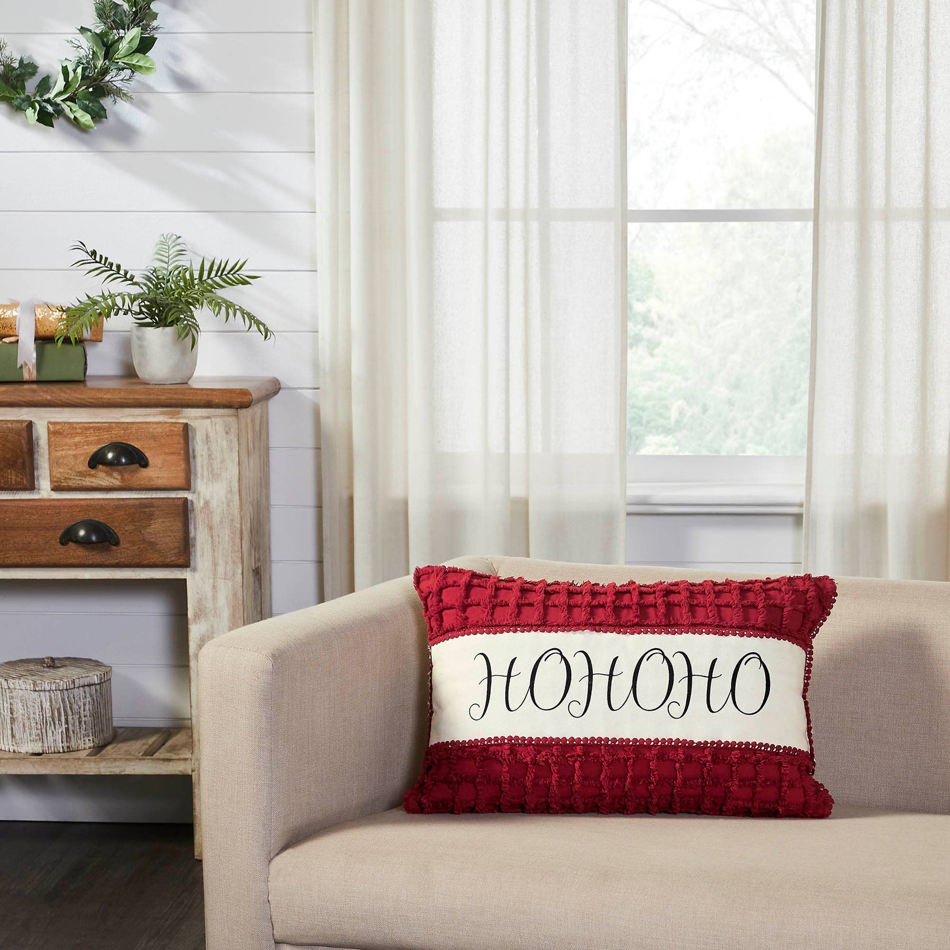 Add festive style with this Christmas accent pillow. The Kringle Chenille Pillow measures 14 by 22 inches. The filled pillow features a charming distressed print for a vintage feel. A bold classic red front features a creme overlay with printed word art reading, HOHOHO in a graceful script. The cozy home accessory reverses to soft creme for casual style while a mini pom pom border produces a warm and cheerful look. Spot clean as needed. Coordinates with the Kringle Chenille Collection by VHC for classic Christmas style for your whole home.