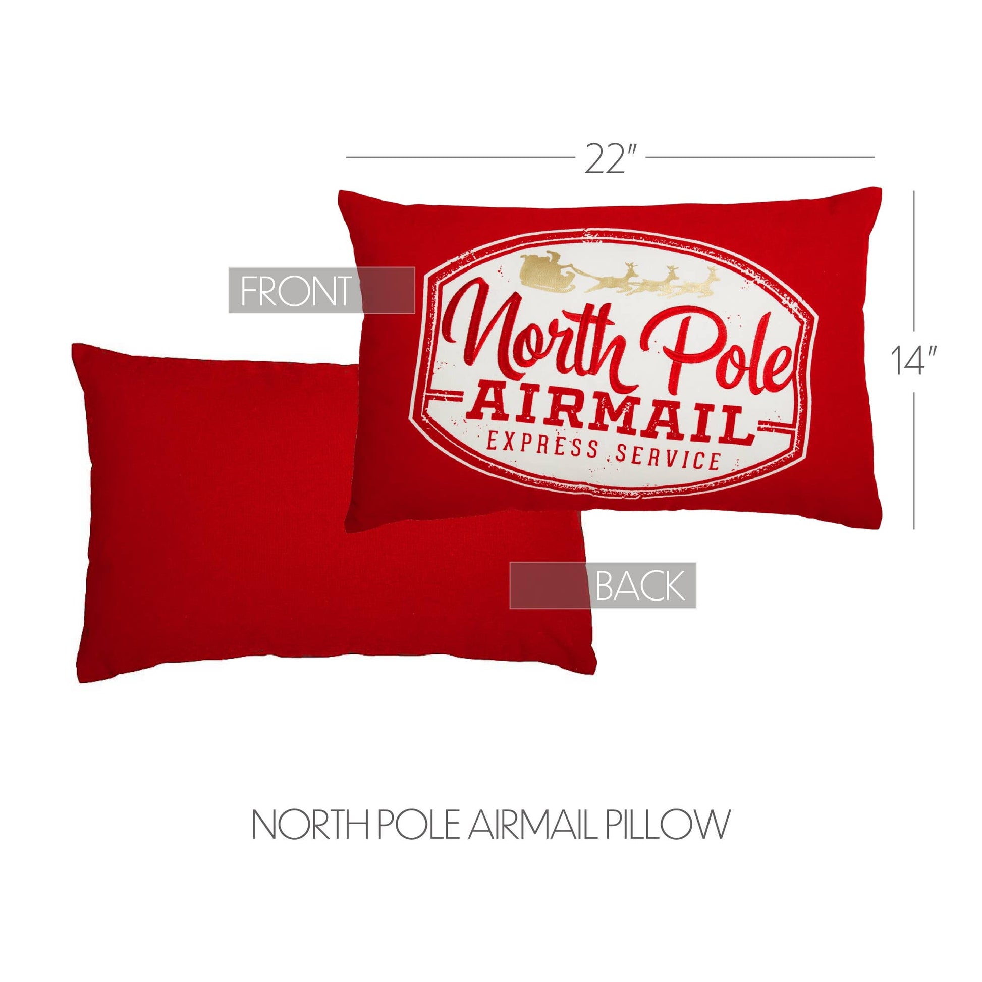 Bring a pop of color to your Christmas decor with the North Pole Airmail Pillow. This whimsical holiday pillow has the words "North Pole", "Airmail" and "Express Service" in cherry red with a gold appliqued silhouette of Santa's sleigh and reindeer above the cursive "North Pole". With its vintage appearance due to the weathered look of the design and stitching, this 14x22 sturdy decorative pillow adds rustic old-time whimsy to wherever you place it in your home. Reverses to a solid red with a zipper on the bottom. Machine washable and iron safe. Includes: 1 x Pillow Cover; 1 x Pillow Insert Care Instructions: Machine Wash, Tumble Dry Low, Iron Safe Material: 65% Polyester / 35% Cotton Shell, Polyester Pillow fill.