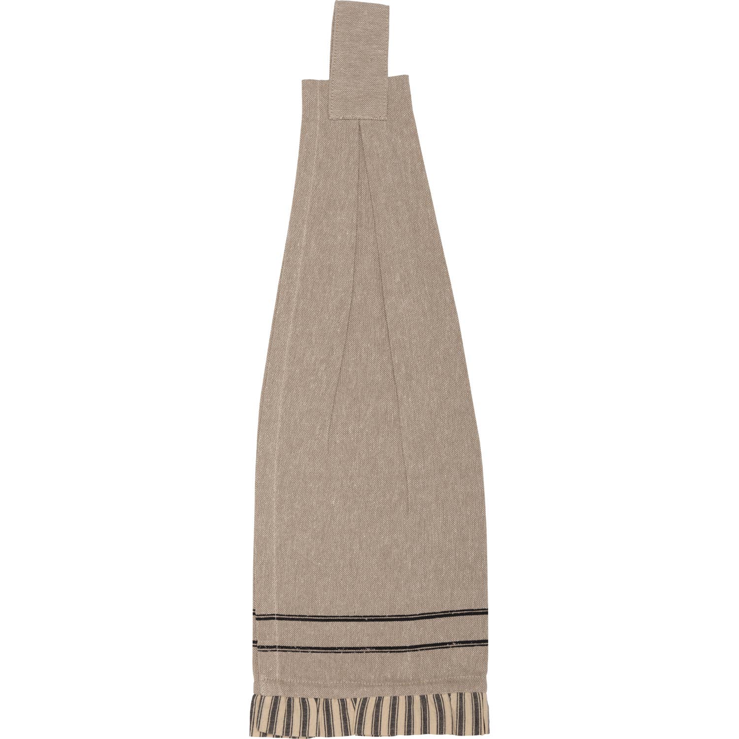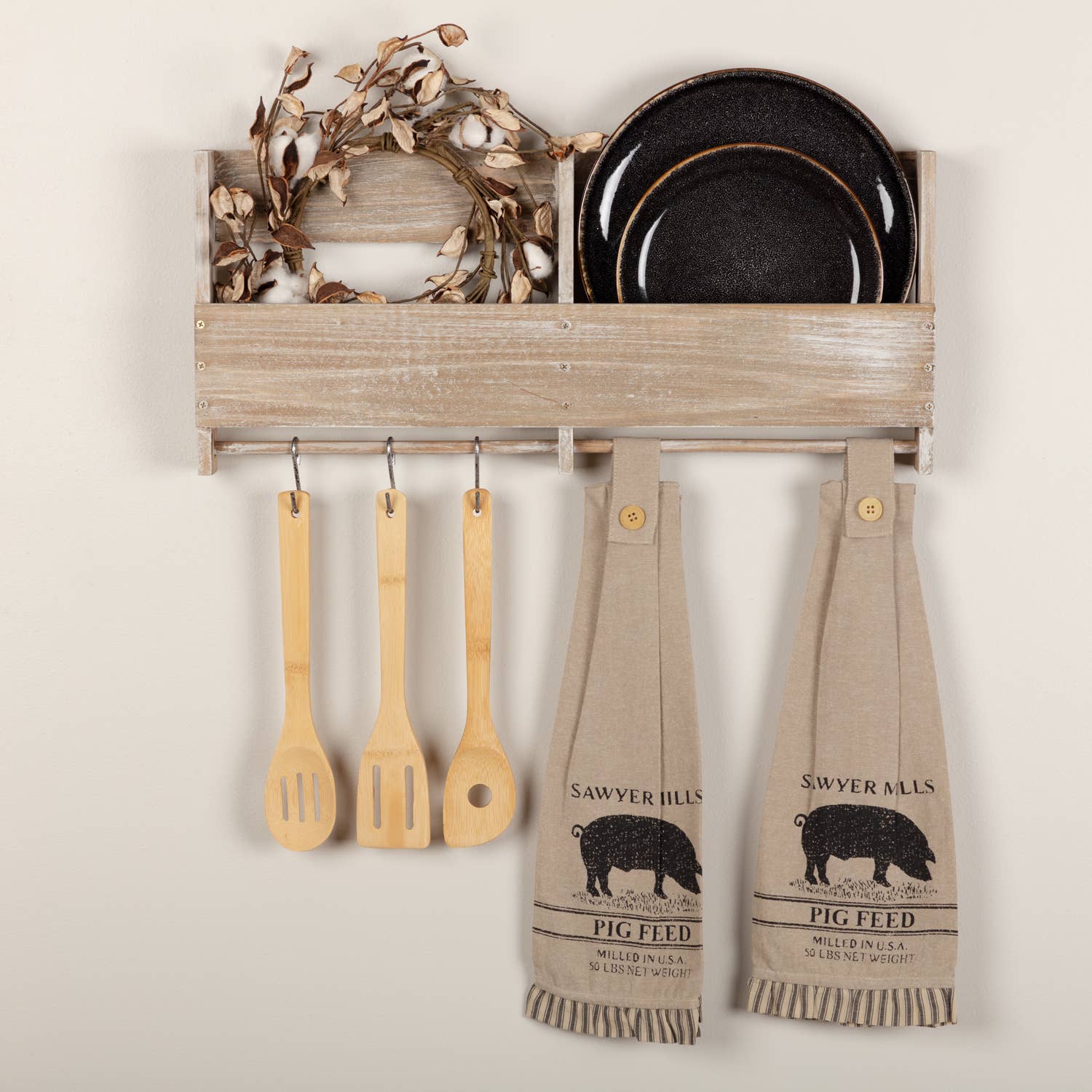 The Sawyer Mill Charcoal Pig Kitchen Towel Set brings a unique farmhouse look to your kitchen. Featuring a weathered pig stenciled in black, this hand towel set is accented with vintage feed sack details. These tea towels are trimmed with 1-inch dark creme and black ticking stripe ruffle at the bottom.